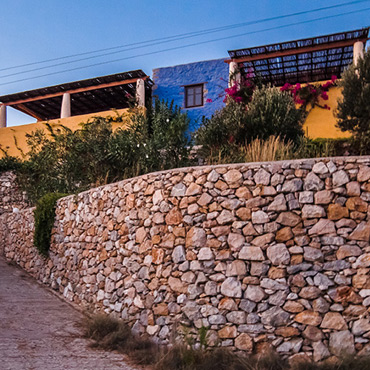 Traditional volumes in stone walls This residence, built in stone, is an example of characteristic island volumes on a slope, with different levels, stairs, terraces, hidden corners and a superb view of Alinda bay in Leros island.